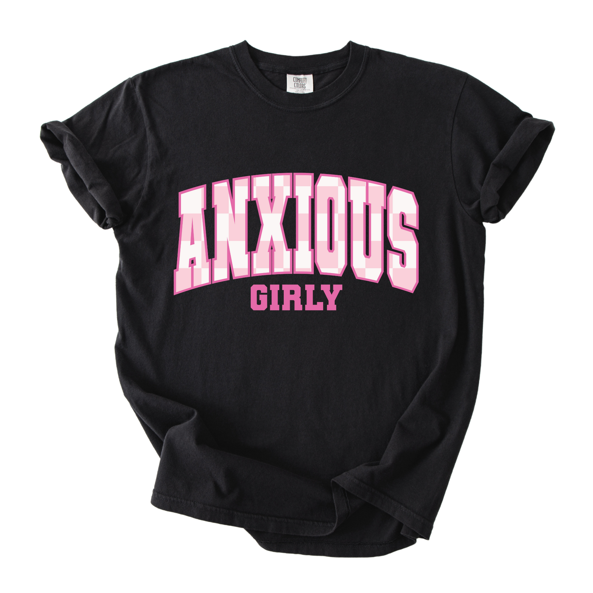 - Design: Bold "Anxious Girly" lettering for a playful, confident statement