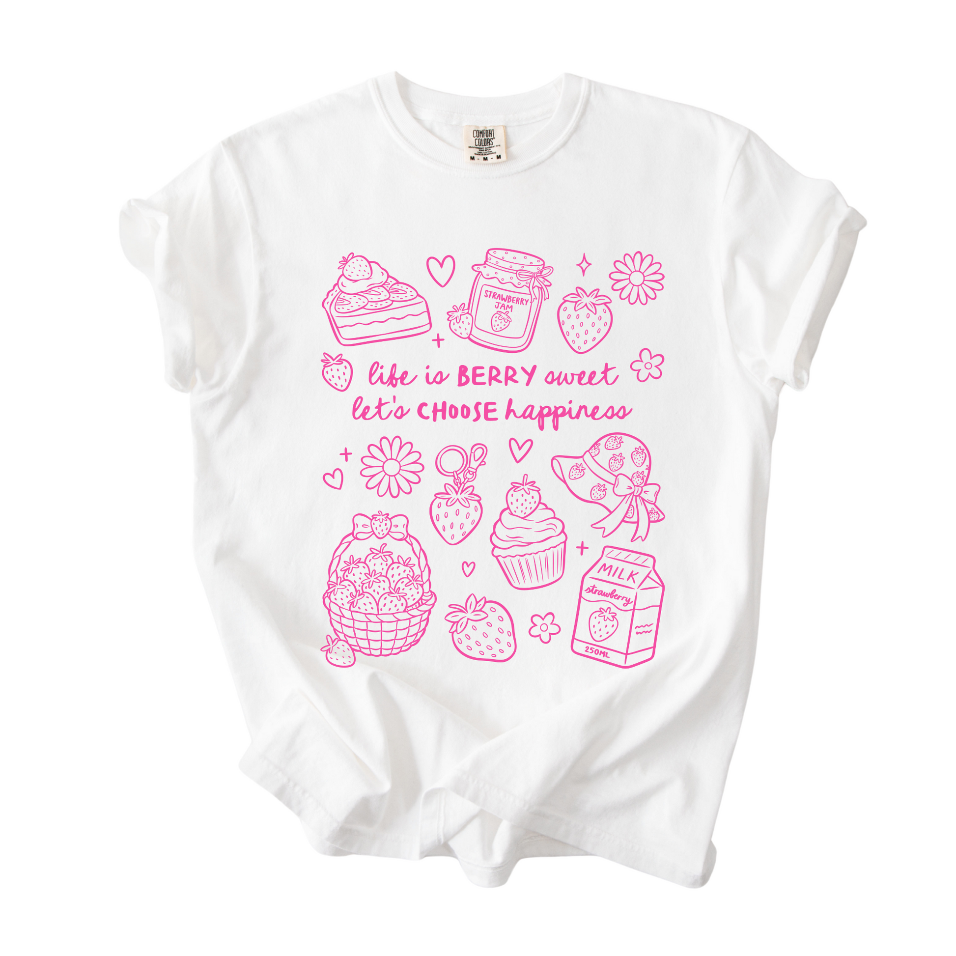 Add a little sweetness to your day with our “Life is Berry Sweet” graphic tee! Featuring a playful hand-drawn design with strawberries, flowers, and cozy treats, this tee reminds you to choose happiness, one berry at a time.